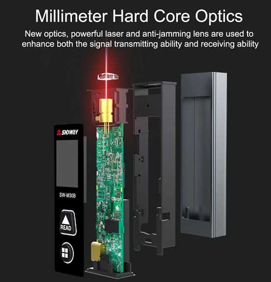 - امکانات نرمافزاری: قابلیتهایی مانند محاسبه مساحت، حجم، قضیه فیثاغورس برای اندازهگیری غیرمستقیم ارتفاع، و ذخیره آخرین اندازهگیریها.
